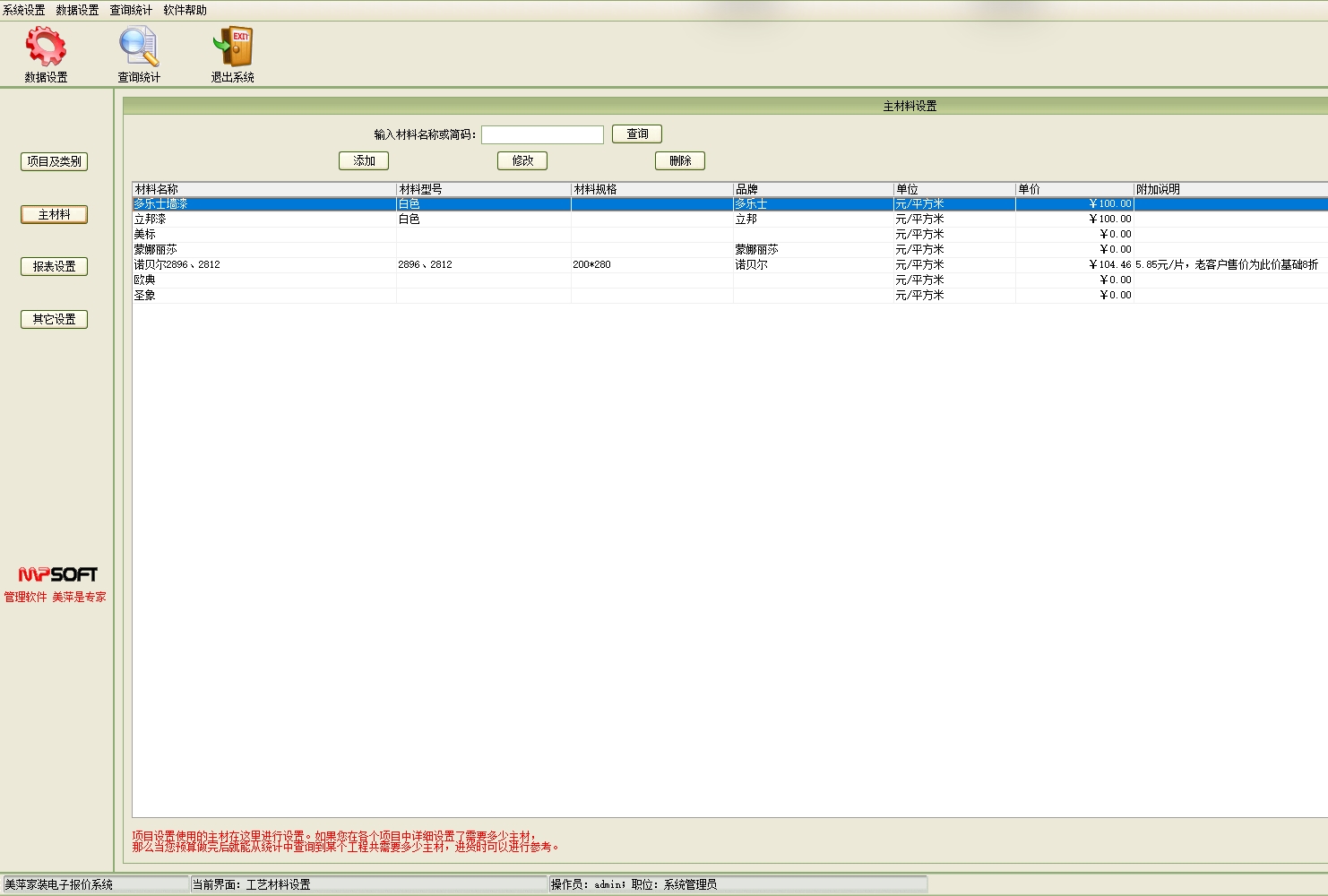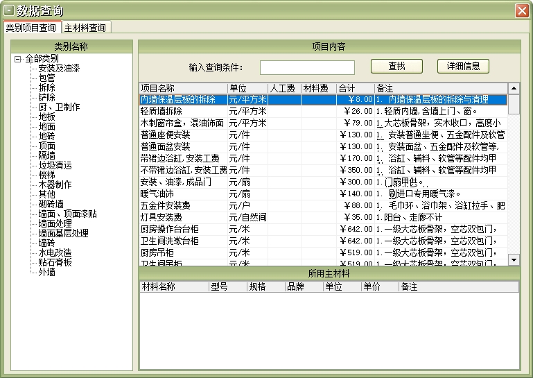 第二:家装公装装修电子报价软件可以管理主材料:主材料信息中保存的是工程中所用到的主材料名称,型号,单价,数量等。