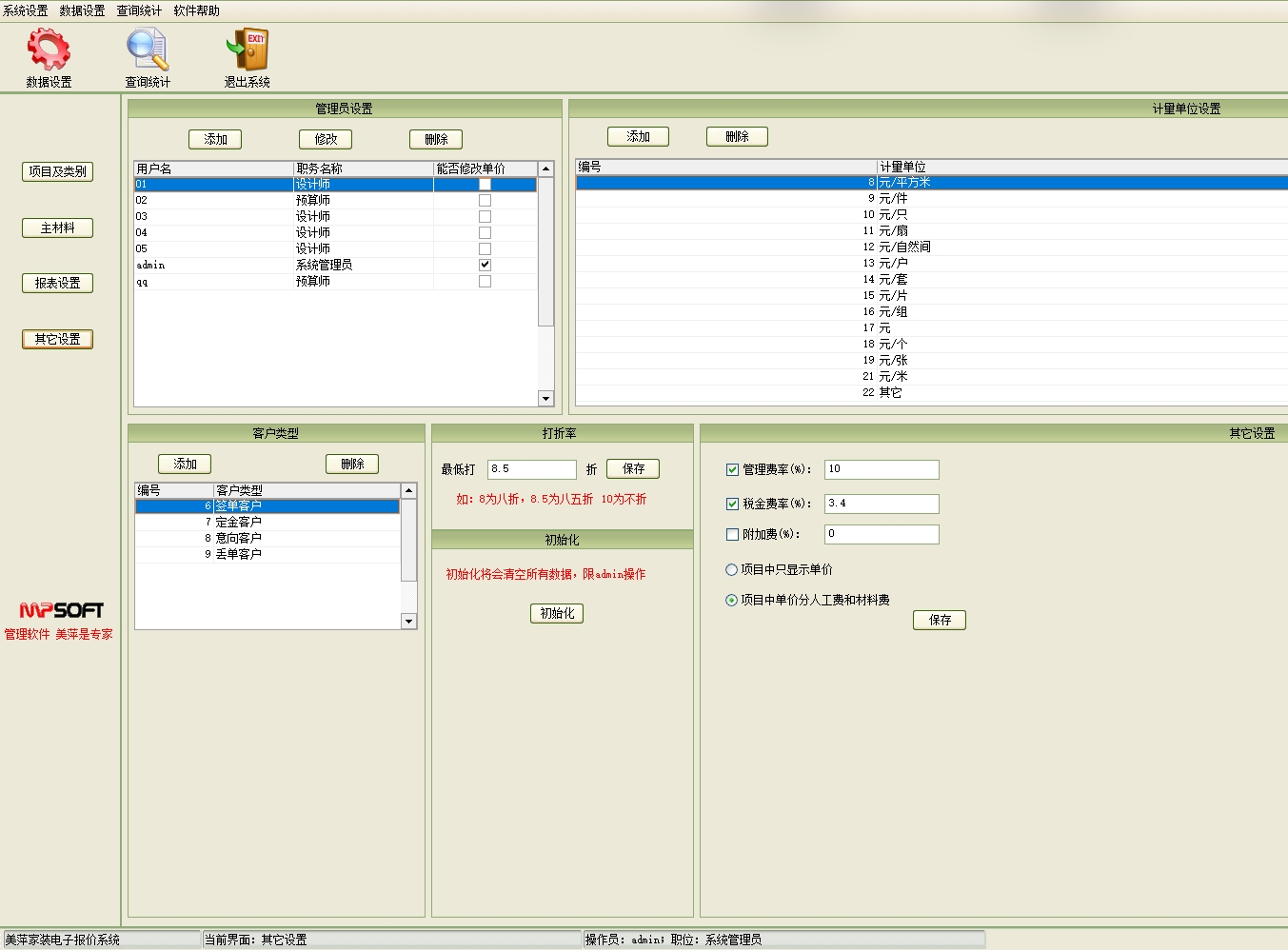第四:家装公装装修电子报价软件具有其它设置:其它设置中主要是对管理员,计量单位,客户类型等信息。