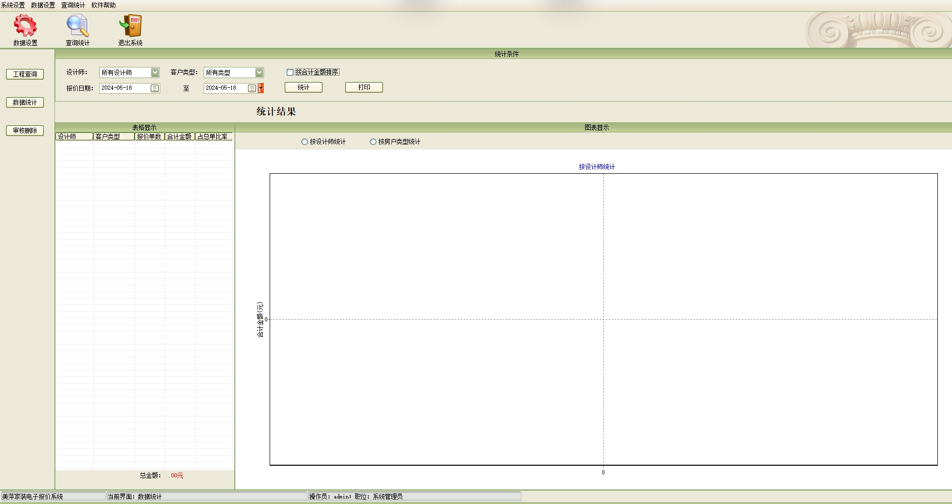第六:家装公装装修电子报价软件具有数据统计:能够统计出不同设计师,不同客户类型的报价金额,能够以表格和图表显示。