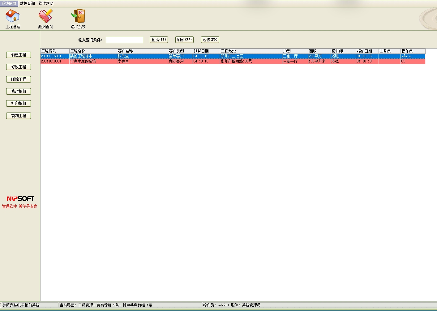 第五:家装公装装修电子报价软件具有工程查询:查看所有报价单,可以根据不同的条件查询不同的报价。