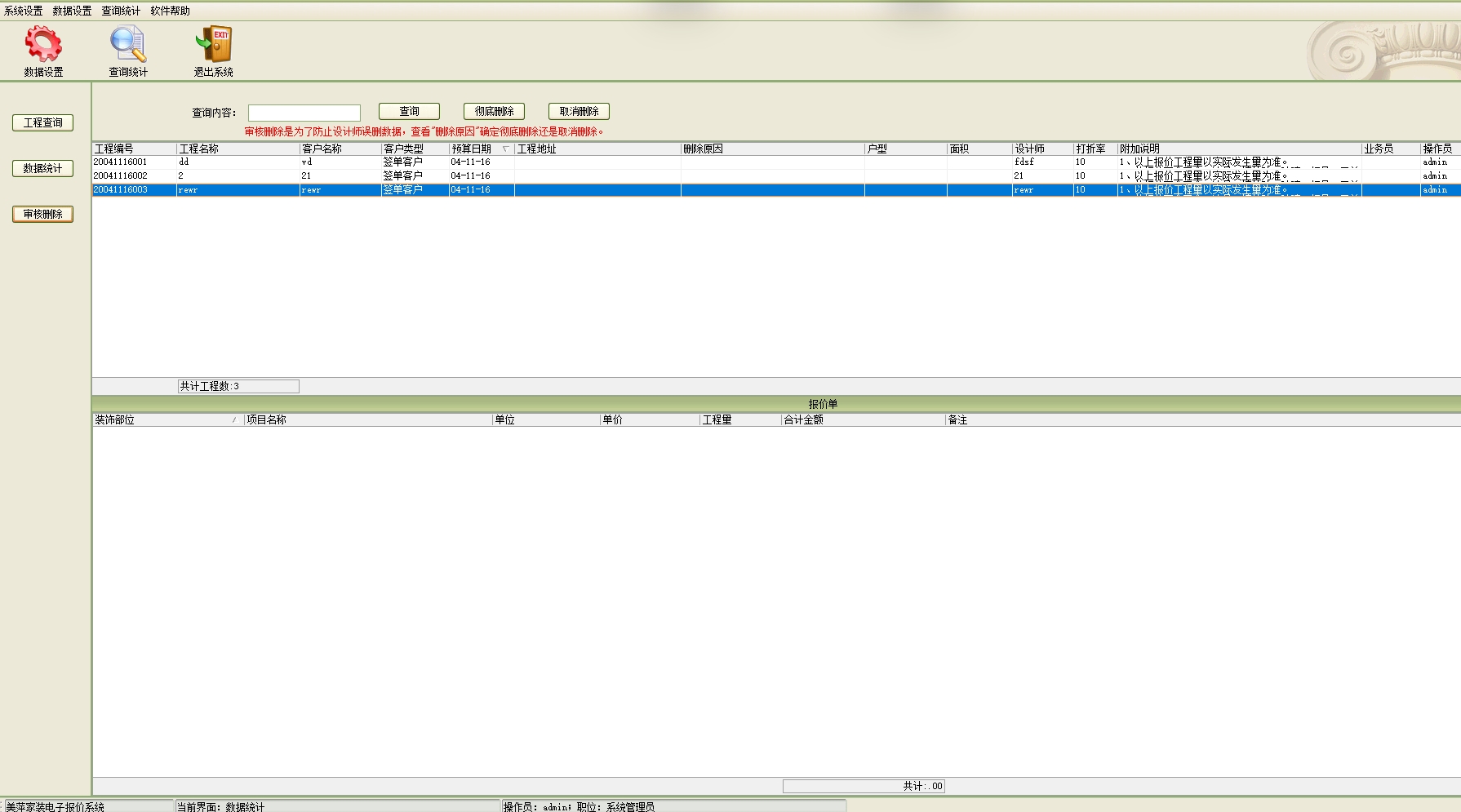 第七:家装公装装修电子报价软件具有审核删除:是对设计师删除的报价单进行审核