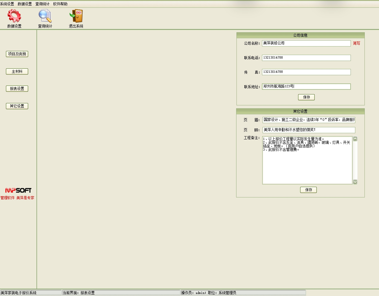 第三:家装公装装修电子报价软件具有报表设置:在打印报表时显示的页眉,页脚,公司的基本信息。