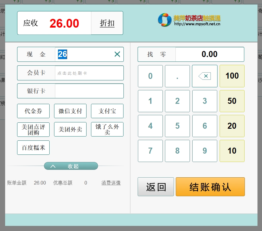 第八:奶茶店触摸通(同旺店)软件收银结账支持现金、储值、银联卡、微信支付、支付宝、代金券和美团点评验券等多种付款方式联合结账。