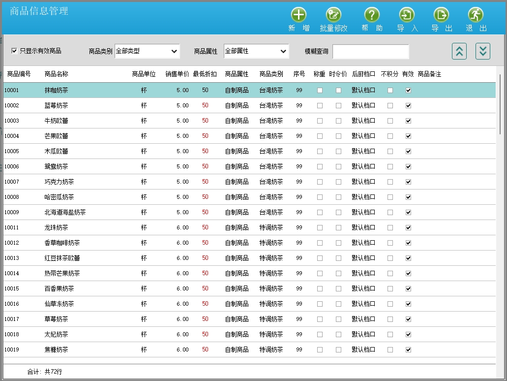 第十一、奶茶店触摸通(同旺店)软件支持强大的商品管理功能,商品分为单菜品、商品、原料和套餐4类。