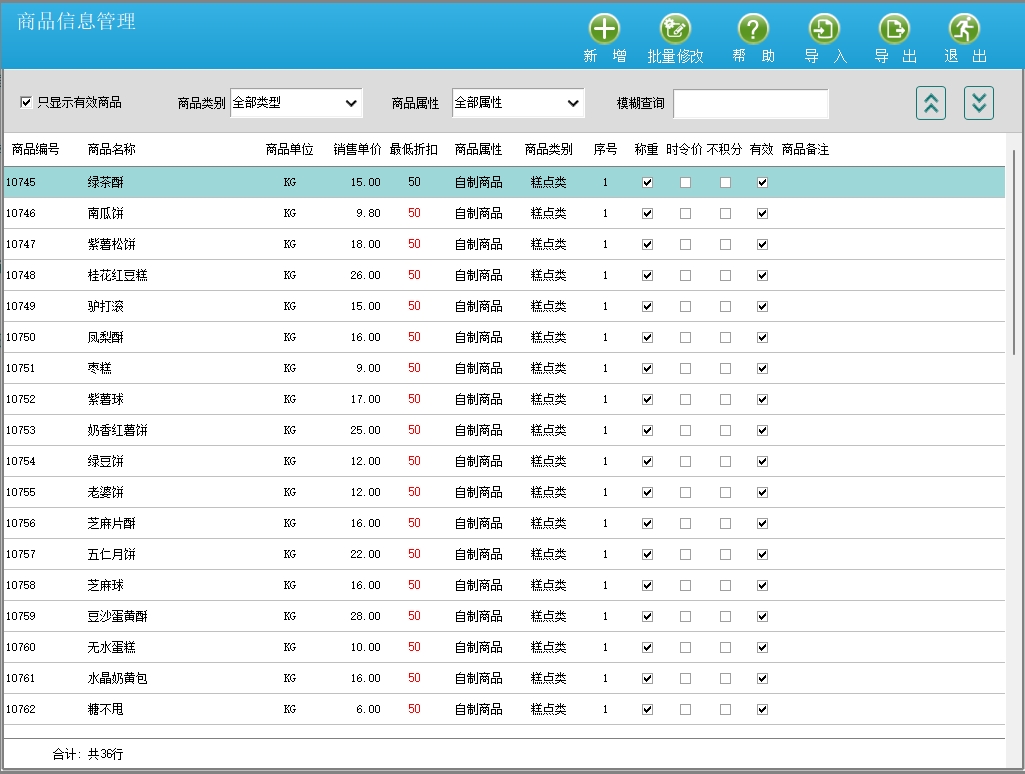 第十一、零食糕点触摸通(同旺店)软件支持强大的商品管理功能,商品分为单菜品、商品、原料和套餐4类。