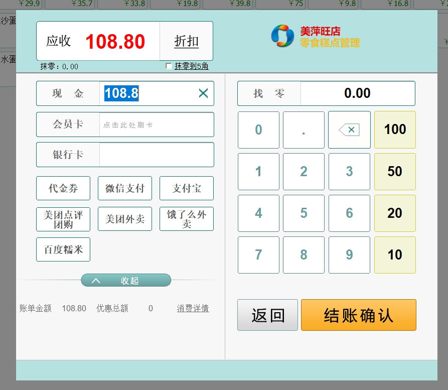 第八:零食糕点触摸通(同旺店)软件收银结账支持现金、储值、银联卡、微信支付、支付宝、代金券和美团点评验券等多种付款方式联合结账。