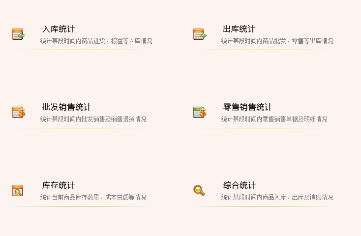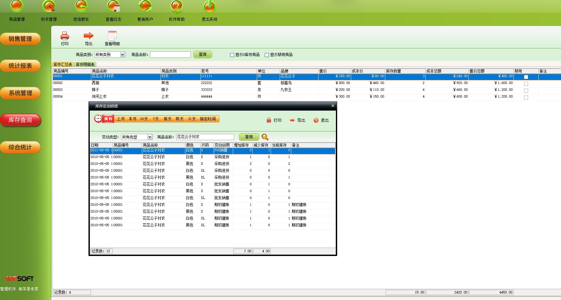 第六:旺店-服装(又叫服装通)软件具有综合统计:统计某段时间内商品入库、出库及服装情况。
