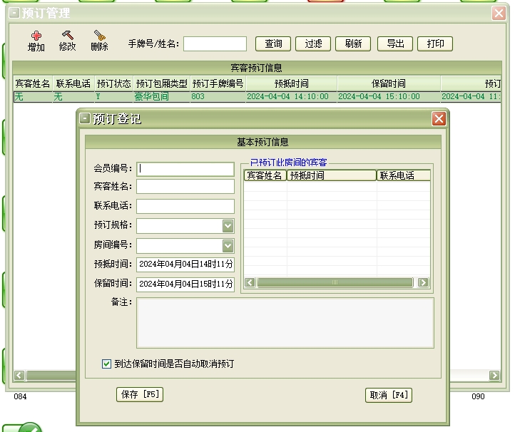 来宾登记→顾客开单:每个客户发生消费前必须进行登记(建立客户帐),给客户安排一个包间(手牌)等包间项目,包间项目必须是在“系统设置”模块中的“包间项目”中已经设置,系统只能对已设置的包间项目(手牌)进行登记。