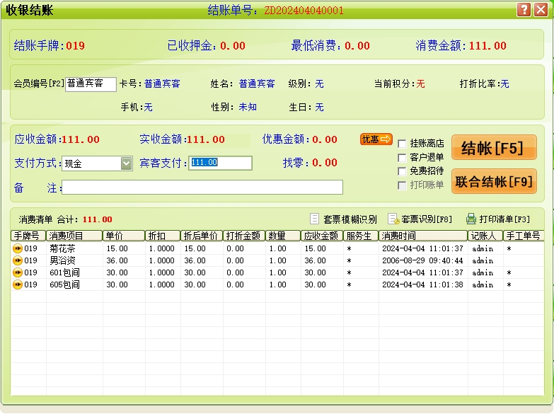第十七:采耳软件收银结账→宾客结帐:终结客户当前的消费活动,并进行收款及自动还原包厢项目(手牌)的占用状态为可供状态。