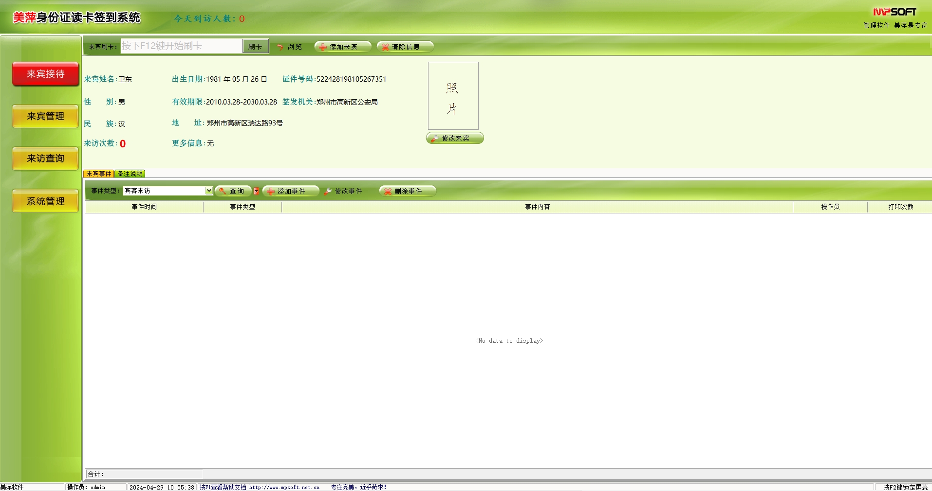 搜索关键词:美萍二代身份证读卡签到系统,美萍员工签到软件,美萍客户来访软件,美萍礼品发放软件,美萍临时会议来访登记软件