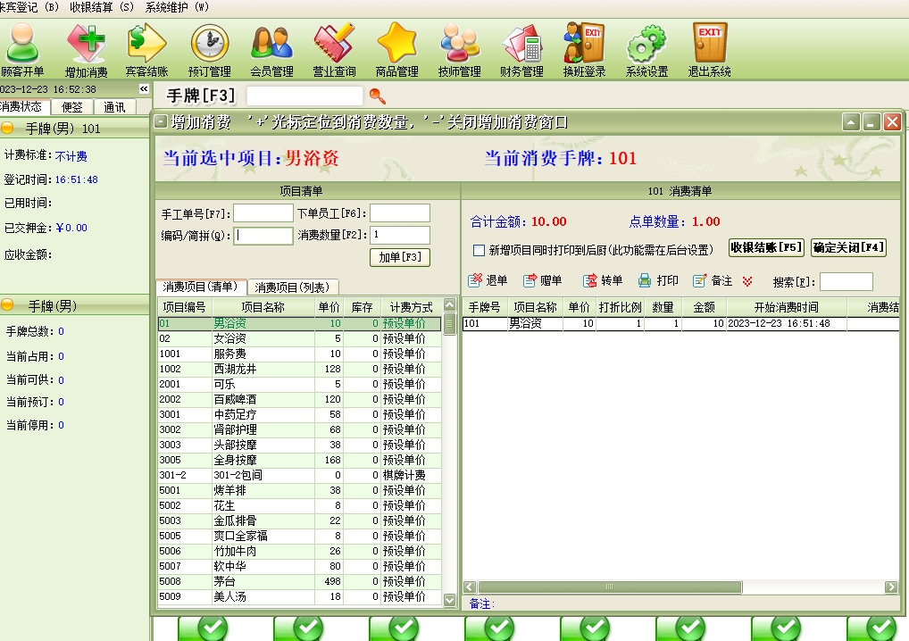 第十六:休闲会所软件点单消费→增加消费:客人在消费过程中所消费的所有项目均要进行入帐处理,以便在客人离店时自动计算消费额。客人的消费明细便是在此入帐。
