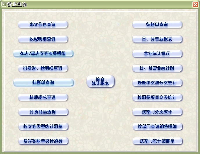1、营业信息查询模块:包括来宾信息查询、在店/离店宾客消费查询、收银明细查询、退单查询、服务生提成查询、结帐单查询、挂帐查询、日/月营业报表、日/月营业统计图、营业统计排行、按消费项目分类统计、部门分类统计、部门收银汇总、账单分类统计、综合统计报表、会员查询、会员消费信息查询和储值卡会员在各分店的储值信息查询等。
