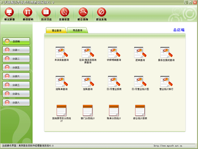 美萍服务类软件系统连锁店版采用先进的VPN技术及虚拟专用网进行安全连接,实现领导层实时进行各分店的营业情况进行查询分析。支持设置多个分店,领导层只需点击相应分店,即可查询对应分店的实时营业情况。