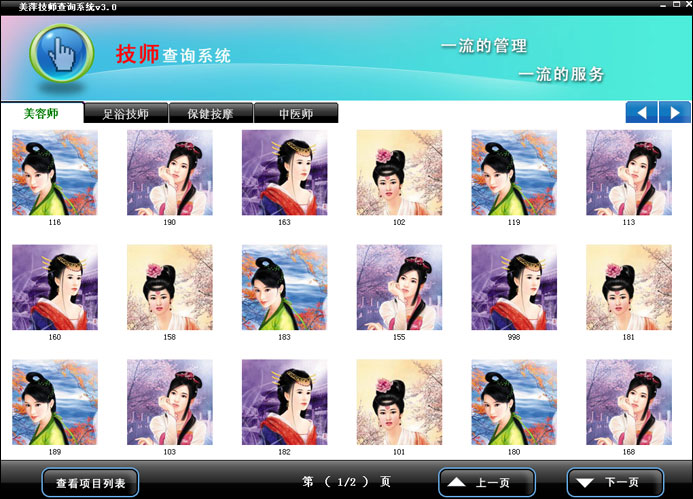 (如果您需要提高会所形象,如果您需要提高服务质量。那么您可以将休闲会所管理系统和技师查询系统结合使用。技师查询系统可以安装在触摸屏设备上,也可安装在普通电脑上。安装后您可以将此终端放置在包间内,也可放在营业区内供顾客人使用。)