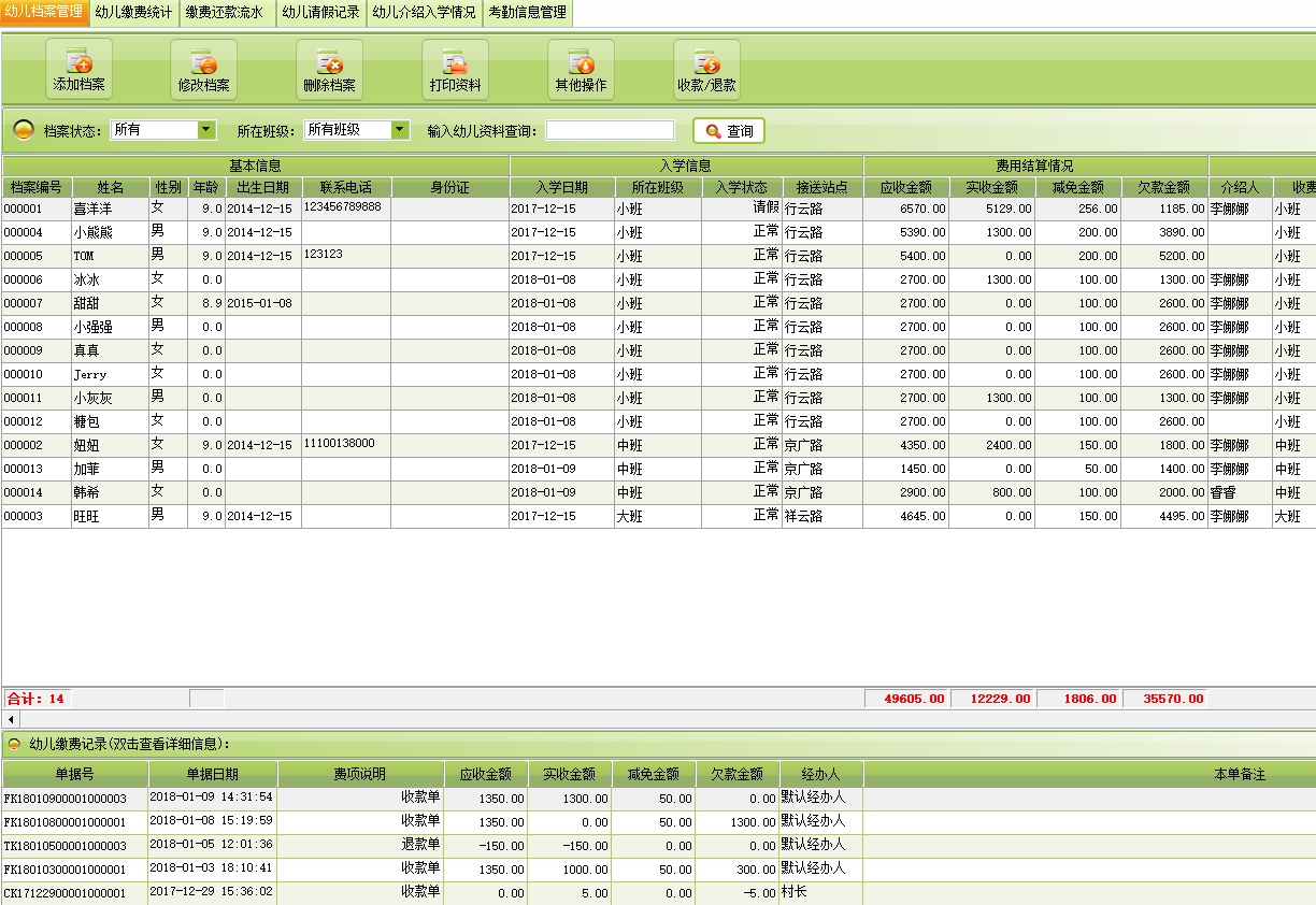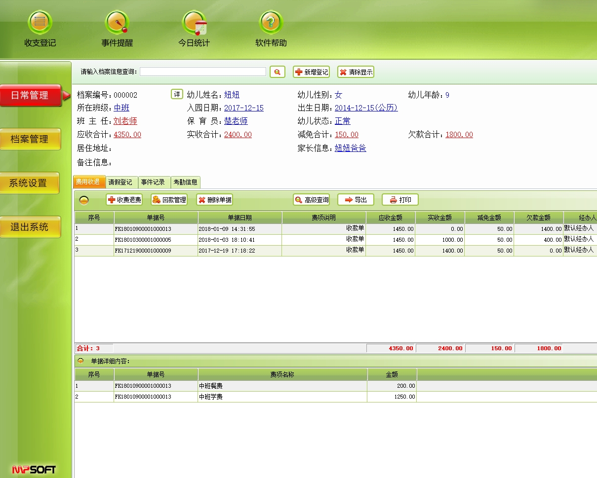 第十:幼儿园软件可以对幼儿的基本信息、幼儿交费情况、事件提醒、幼儿请假等进行有效管理。