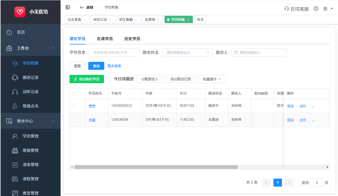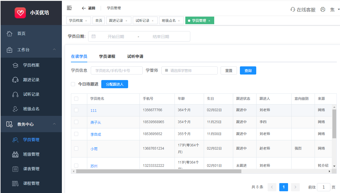 1.临时学员管理(临时学员导入、跟进、转正式、试听)