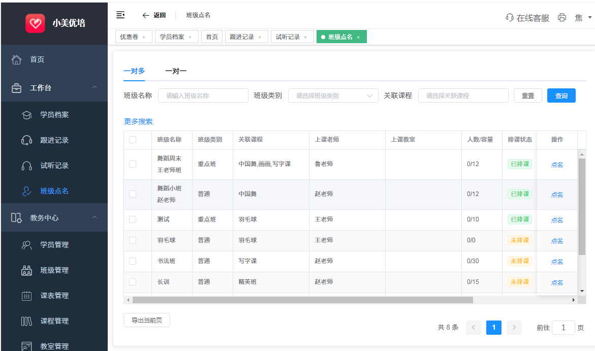 3.学员点名(老师根据班级报读课和批量完成点名)
