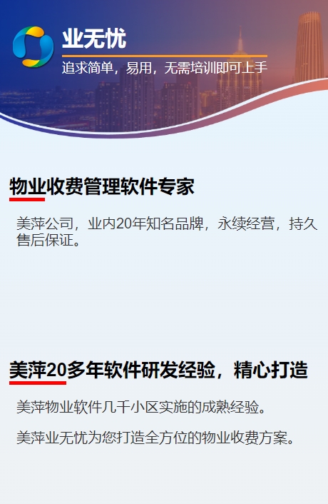 美萍业无忧管理系统软件(专业的SAAS模式的物业管理软件)由美萍软件公司及核心研发团队深入物业业务一线,了解业务痛点需求,精心开发,是专业的小区物业智慧管理软件,为各类物业收费单位提供了一套全面智能的业主物业收费解决方案,物业公司可以非常方便地管理旗下1个或多个房产,多个项目统一到云平台,集中管理,一目了然。功能包括了收物业费、收水电费、收停车费、收专项费、收公推费、收费通知、业主App一键报修等强大的收费功能。可以针对不同楼栋,制定个性化的管理方案,允许配置多种收费规则。美萍业无忧软件延续了美萍独有的操作简单、容易上手、移动应用等优势,傻瓜式操作,无电脑知识的普通用户都能够轻松掌握软件的操作流程、使用方法。业无忧软件广泛使用于高端住宅、小区、大型社区、商业办公楼、写字楼、各类型厂区业无忧、共享商业业无忧、市场商铺租赁业无忧、景区业无忧等管理部门,实现了物业管理的智能化和精细化,大大提高了管理人员的工作效率,是我国建设智慧社区的必备管理工具。