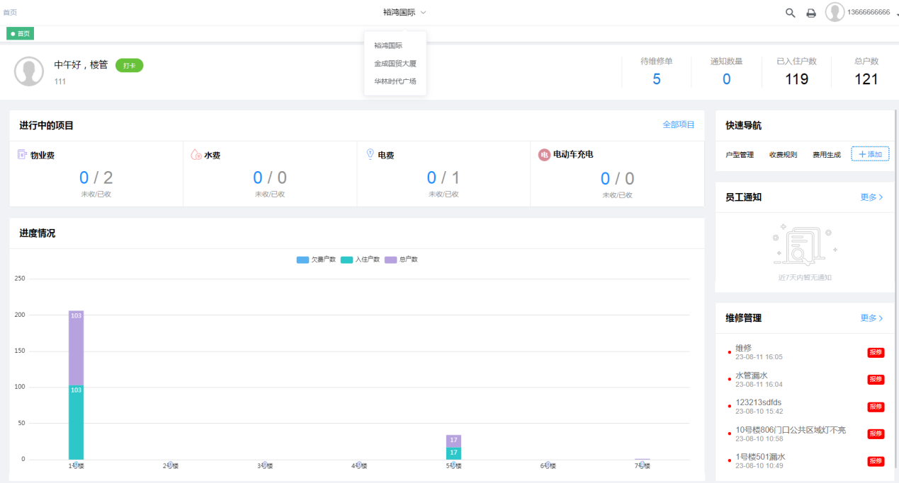 第三:业无忧软件具有多小区管理(官网首页直接切换小区信息)。