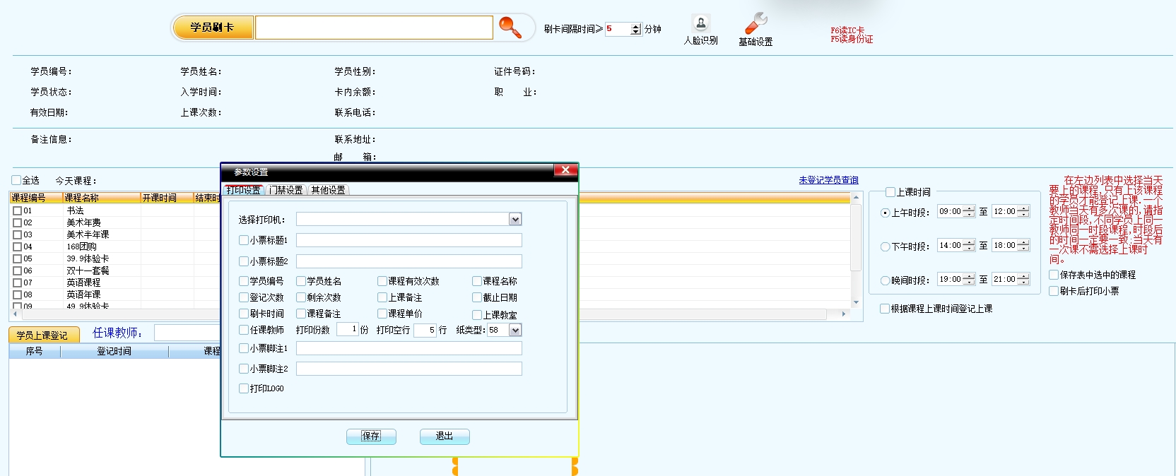 第十二:培训班软件的前台门禁模块,是单独的一个程序,进行学员刷卡登记,可以根据学员的情况判断出是否放行或请假、到期等提示。