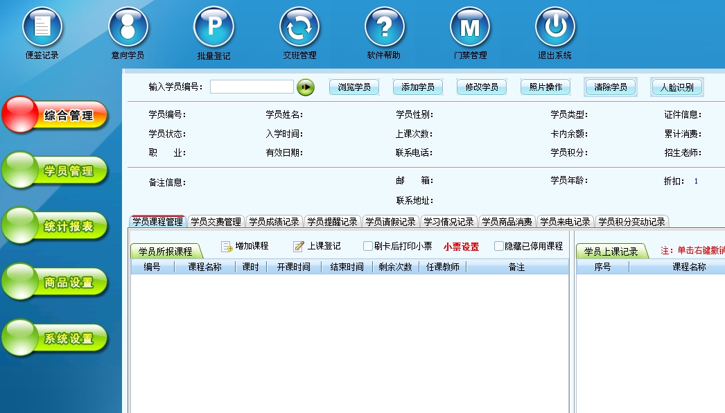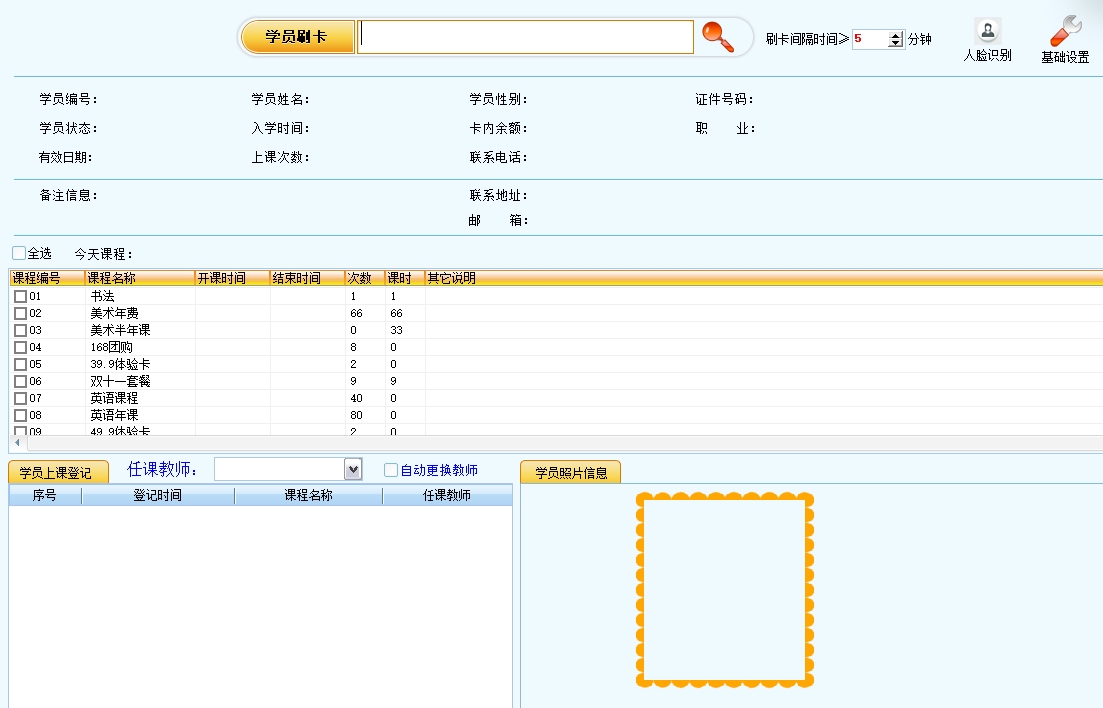 第一:培训班软件具有人脸识别功能,针对采集过照片的学员,可以不带会员卡,直接使用人脸识别技术来刷卡的功能。此功能具有高效,精准识别,自动判断摄像头中是否有人脸,精准找到学员。