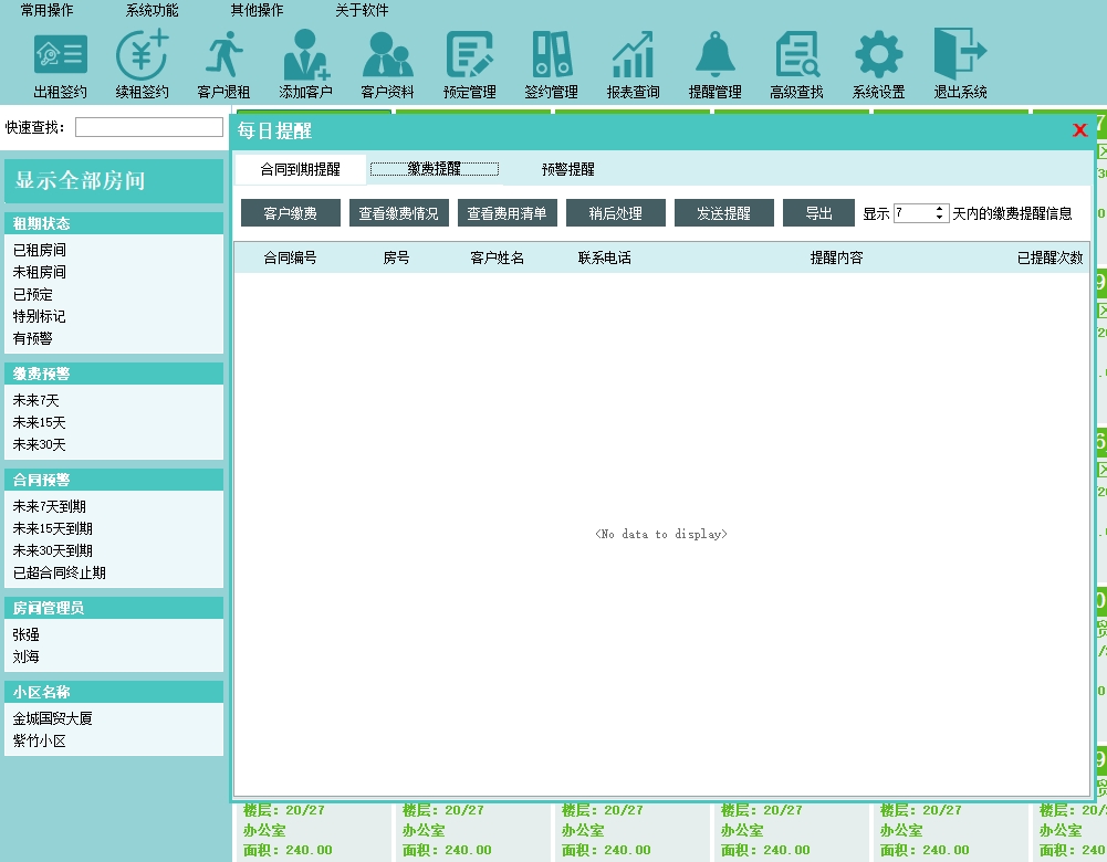 第四:公寓出租软件支持显示预警、缴费和自定义类型的提醒信息,支持自动提醒。
