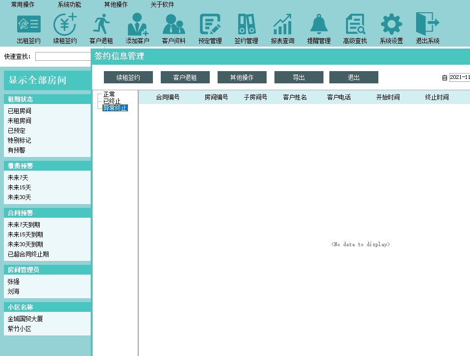 第五:公寓出租软件可以管理出租签约信息,支持提前终止合同、合同信息补打以及缴费日历功能。签约管理界面可以快速续签和退租,功能强大方便。
