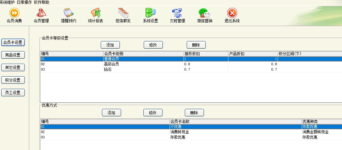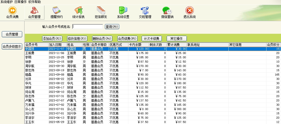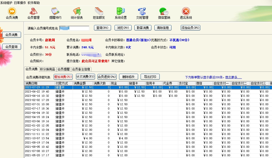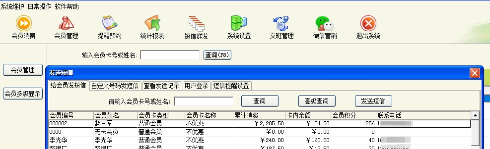 第二:美发(门店)软件支持储值卡、折扣卡、计次卡,会员提醒(包括生日提醒),会员来电提示,短信群发。