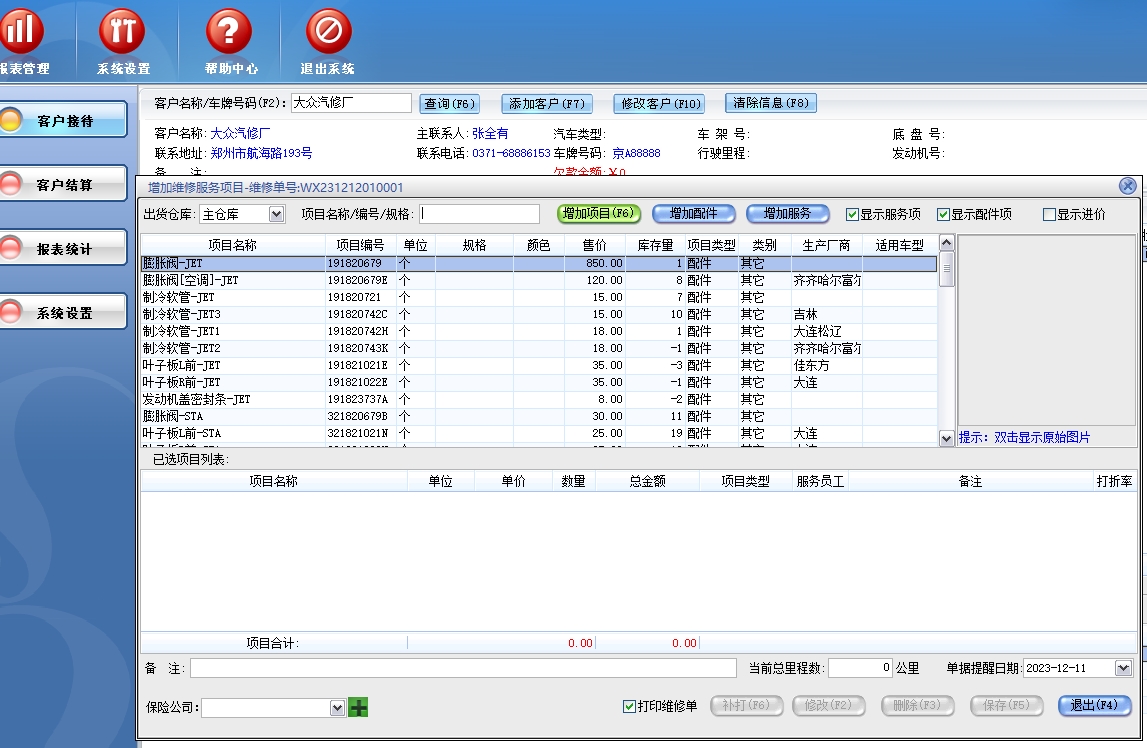 第一:汽车维修软件(汽修软件)可以客户接待,包括添加维修、添加客户。 完成客户下单,调整维修单据配件服务项目。
